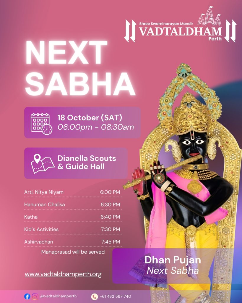 Next Sabha Event Details Join us for the next inspiring Sabha at Shree Swaminarayan Mandir Vadtaldham Perth! Event Details: Date: Saturday, October 18, 2025 Time: 6:00 PM - 8:30 PM […]