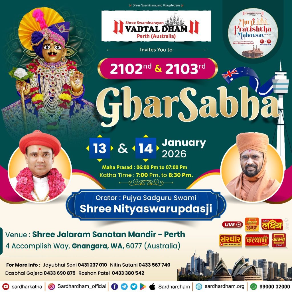 Shree Swaminarayan Vadtal Dham Perth (Australia) cordially invites all devotees and families to join us for a spiritual milestone. We are honored to host the 2102nd and 2103rd GharSabha sessions, featuring divine discourses that promise to enlighten the soul and bring the community together.